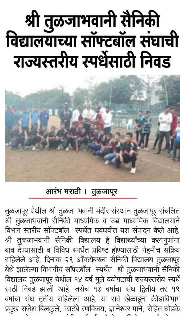 श्री तुळजाभवानी सैनिकी विद्यालयाच्या सॉफ्टबॉल संघाची राज्यस्तरीय स्पर्धेसाठी निवड