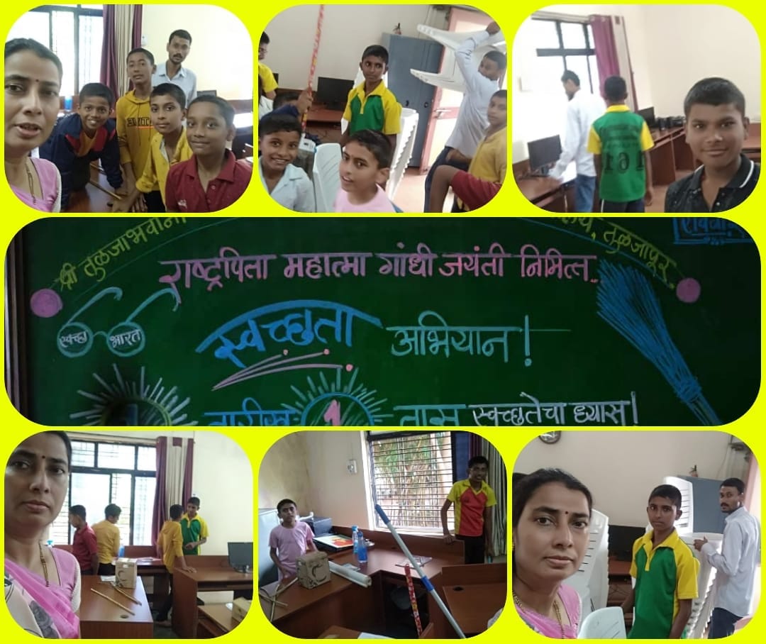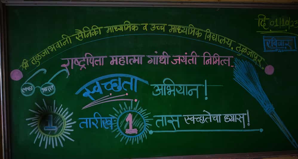 तुळजापूर येथील श्री तुळजाभवानी सैनिकी माध्यमिक व उच्च माध्यमिक विद्यालयात राष्ट्रपिता महात्मा गांधी जयंती निमित्त” एक दिवस – एक तास स्वच्छतेसाठी” या उपक्रमा अंतर्गत शाळेची स्वच्छता, वर्ग खोल्यांची स्वच्छता, वसतिगृहांची स्वच्छता, भोजन विभागाची स्वच्छता, क्रीडांगण स्वच्छता, व साफसफाई विद्यालयातील सर्व विद्यार्थी व कर्मचाऱ्यामार्फत करण्यात आली! “स्वच्छता हा जीवनाचा मूलमंत्र आहे “असा संदेश गांधीजींनी जगाला दिला. तोच आज स्वच्छता दिवस म्हणून स्वच्छता व साफसफाई करण्यात आली. याप्रसंगी विद्यालयाचे प्राचार्य श्रीमान घोडके व्हीबी, संस्कृतिक विभाग प्रमुख श्री स्वामी आर एस. वस्तीगृह विभाग प्रमुख, भोजन विभाग प्रमुख, संगणक विभाग प्रमुख, तसेच विद्यालयातील सर्व शिक्षक व शिक्षकेतर कर्मचारी यांनी स्वच्छतेचे काम आनंदाने व उत्साहाने केले तो क्षण.
