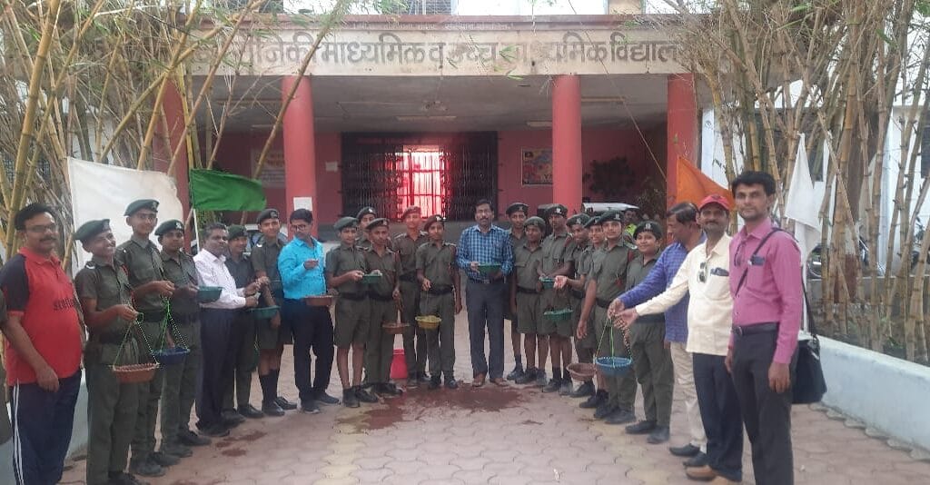 विद्यालयाचे प्राचार्य श्रीमान वैजनाथ घोडके सर व सर्व शिक्षक शिक्षकेतर कर्मचारी तसेच विद्यालयातील सर्व विद्यार्थी यांच्या उपस्थितीत वनराईने नटलेल्या शाळेच्या सुंदर परिसरात चिमण्यांसाठी व सर्व पक्षांना पिण्यासाठी पाण्याचे छोटे टब झाडांना बांधण्यात आले .